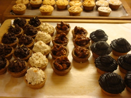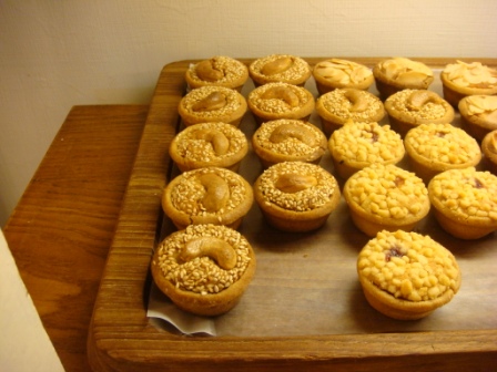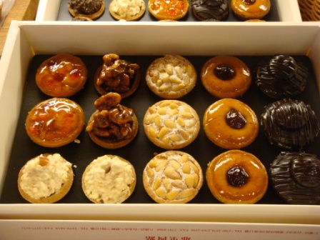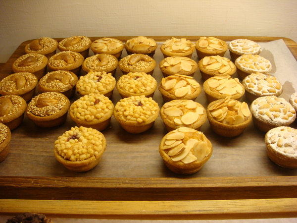 剛剛出爐的菓子塔系列。原來剛剛在路口聞到震驚我的香味就是這盤,熱騰騰剛出爐的果仁香味瀰漫在空氣中。烤的金黃酥脆的菓子塔放在木製的盤子上,每個好像都貼上我的名子了