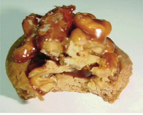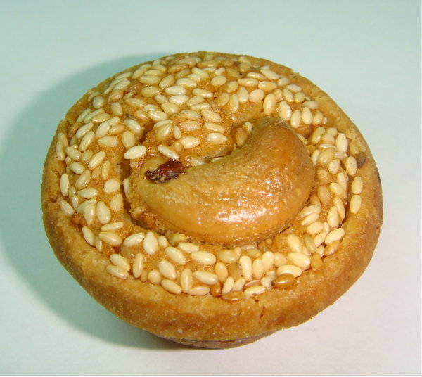 外觀比較樸實的腰果芝麻塔,其實咬下去之後才是驚奇的開始。非常香的芝麻跟裹上薄薄一層楓糖衣的腰果,塔裡面的內餡則是用焦糖做成像是鳳梨酥軟軟的焦糖內餡!
